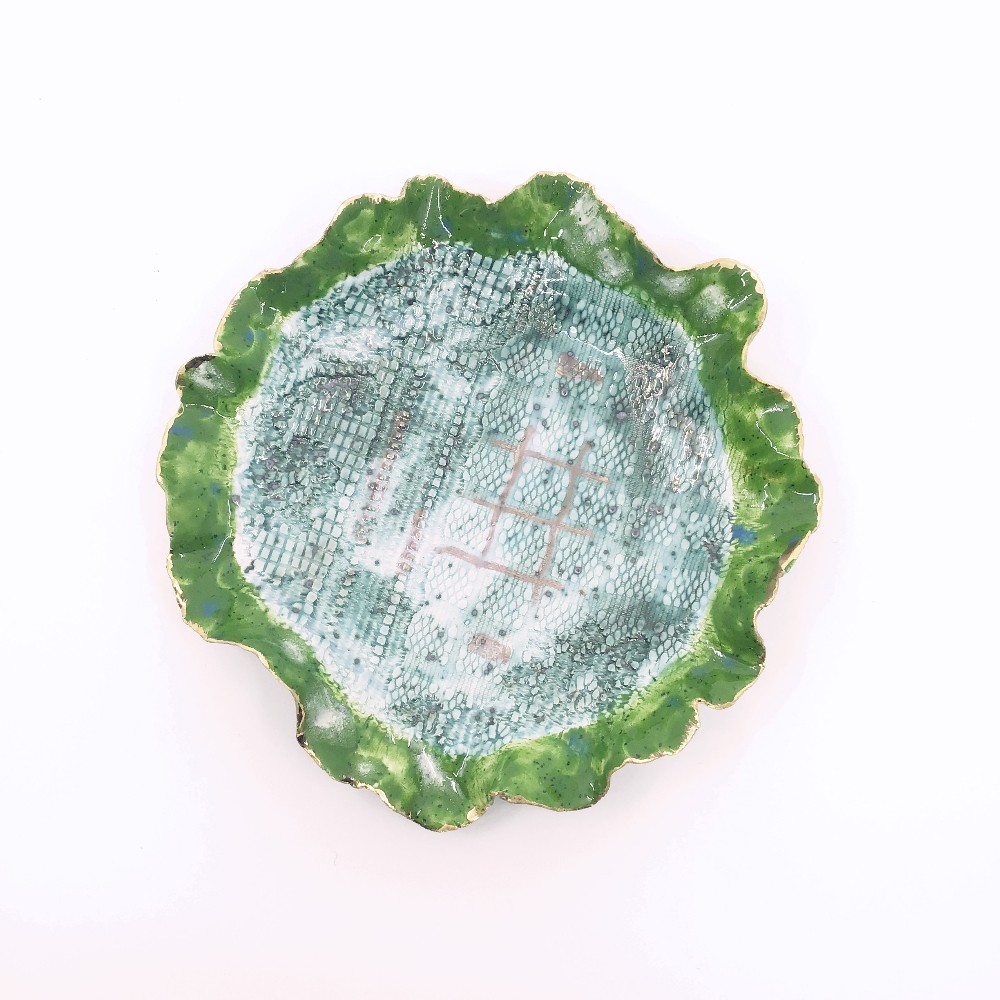 Green and Gold Stoneware Plate.