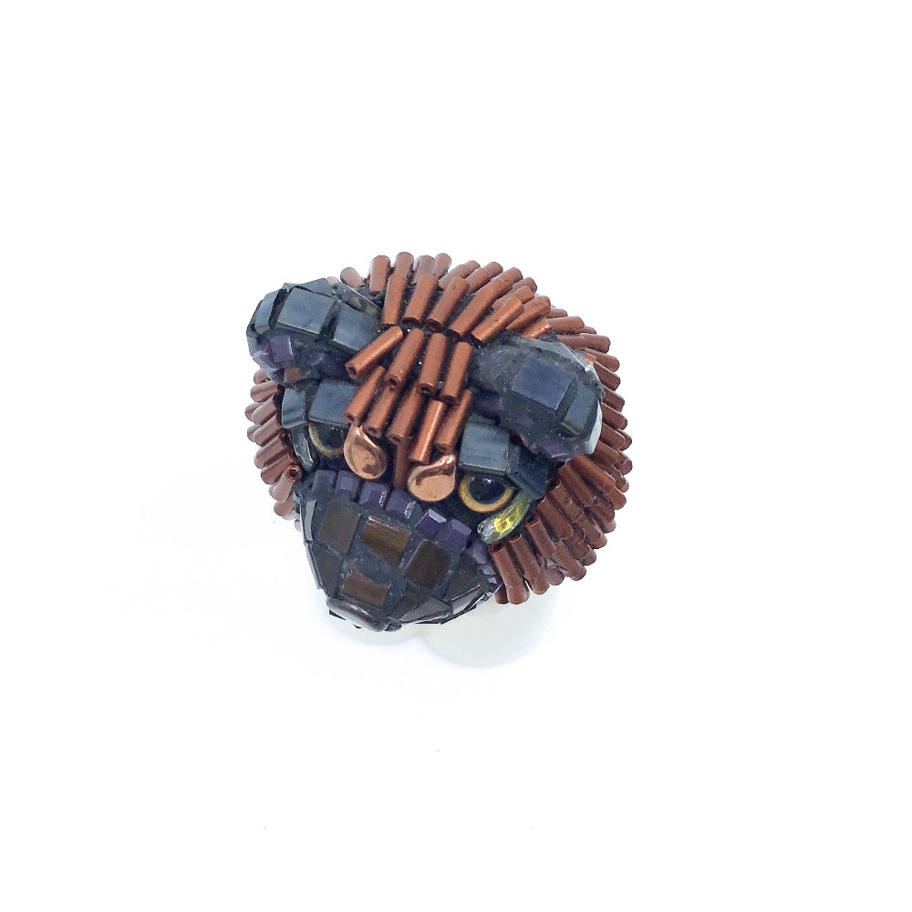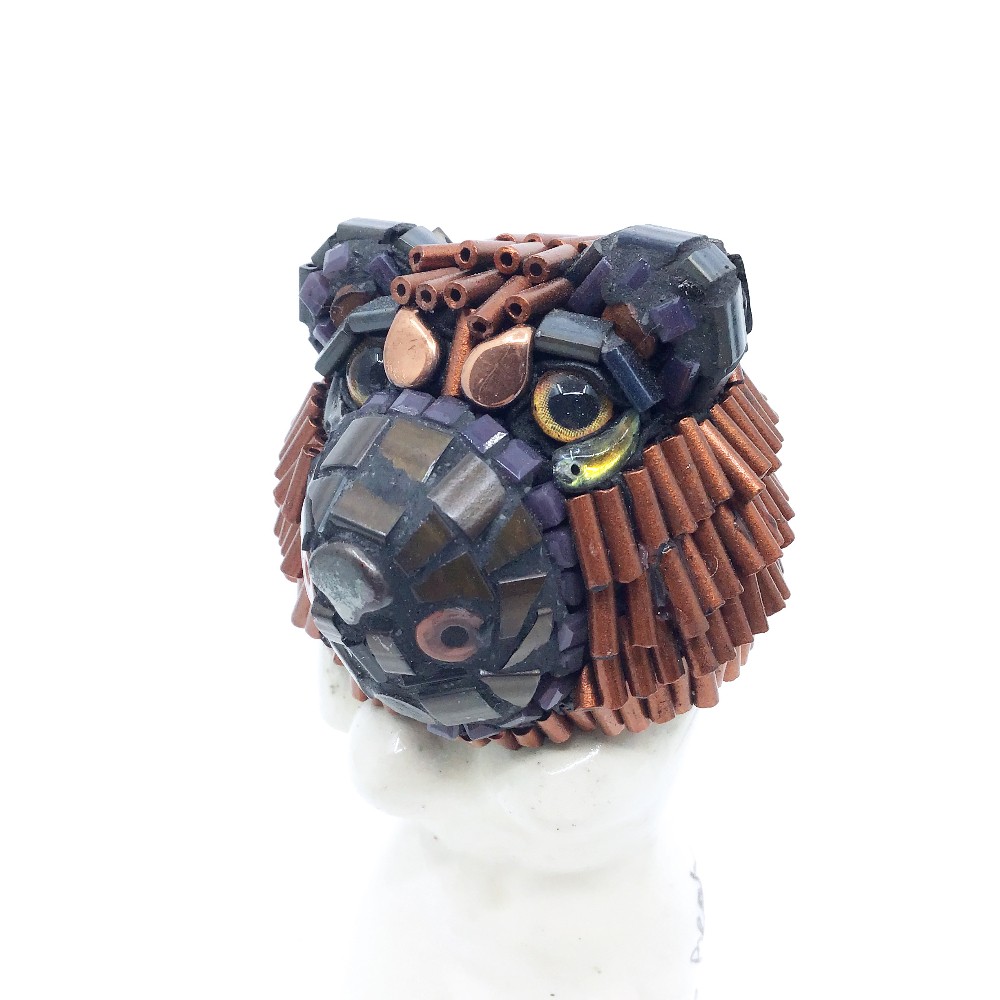 Whimsical ceramic sculpture with a brown bear mosaic head by Caryn Brown