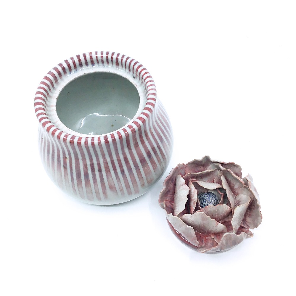Red striped jar with flower lid, ceramic 5" x 5.5"