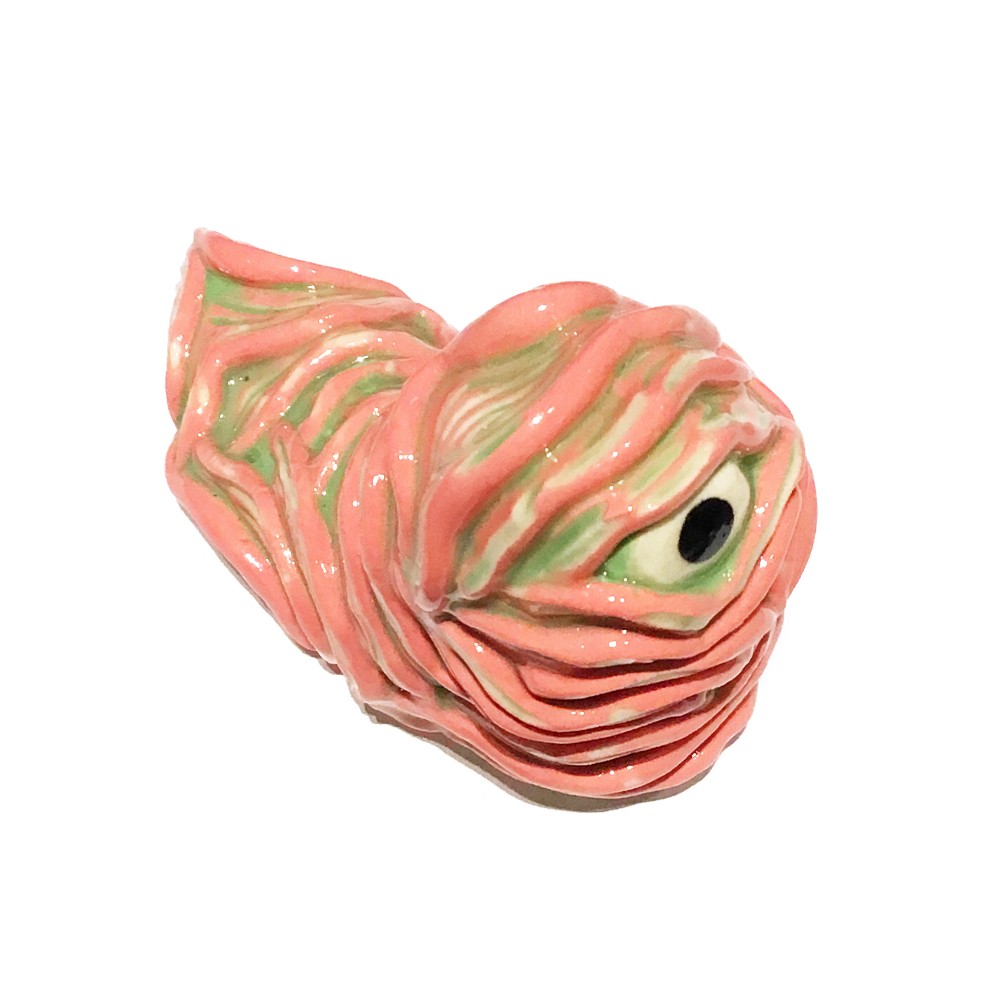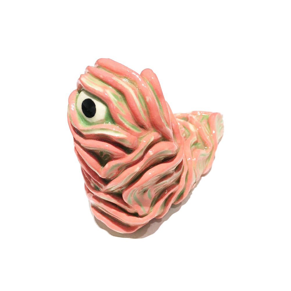 Fun ceramic sculpture of a worm critter in pink and lime green by Emily Farris