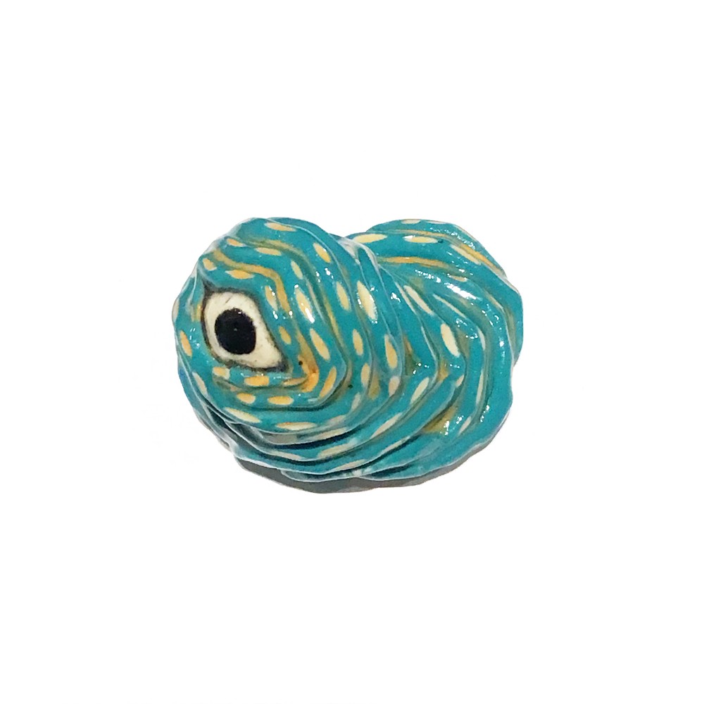Fun, ceramic sculpture of a one-eyed worm in blue & yellow by Emily Farris