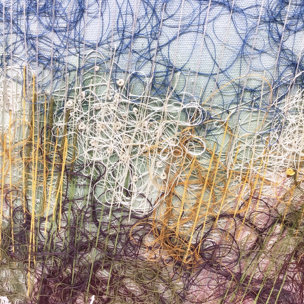 Acrylic paint, embroidery thread; 10" x 10" x .5" framed