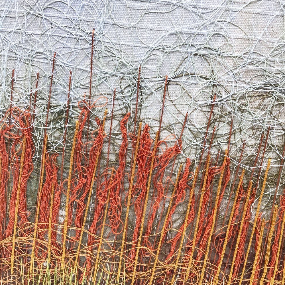 Acrylic paint, embroidery thread; 10" x 10" x .5" framed