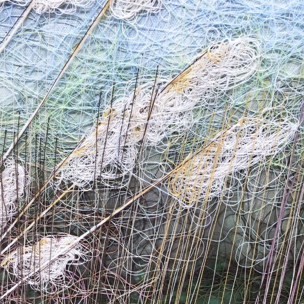 Acrylic paint, embroidery thread; 10" x 10" x .5" framed