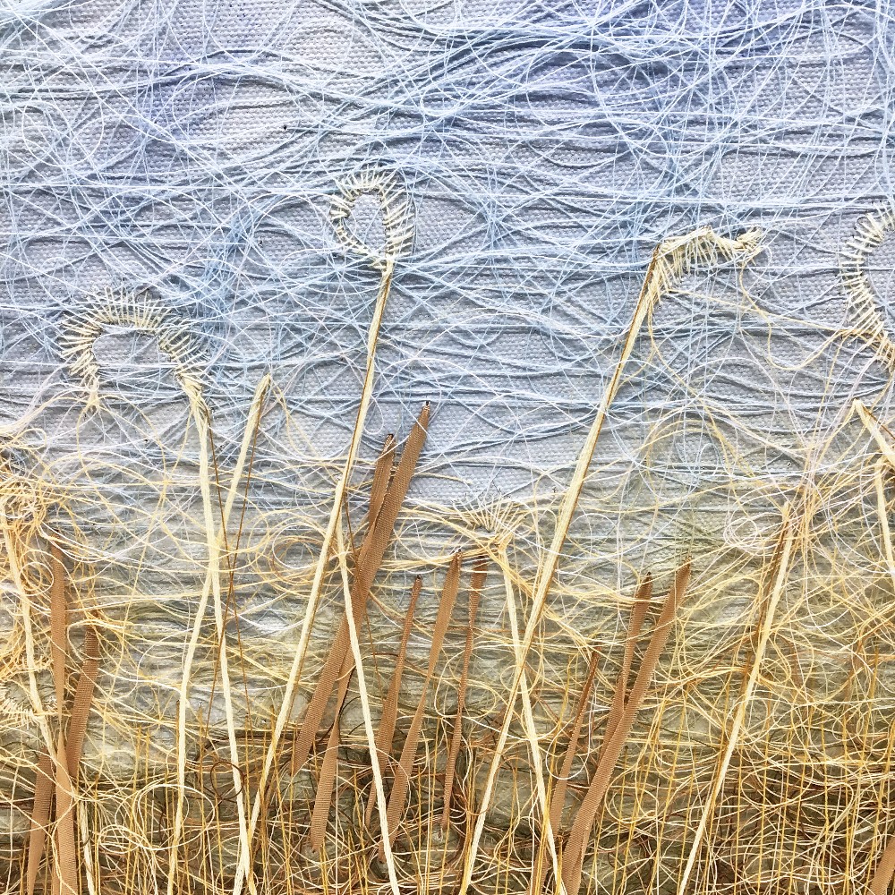 Acrylic paint, embroidery thread; 10" x 10" x .5" framed