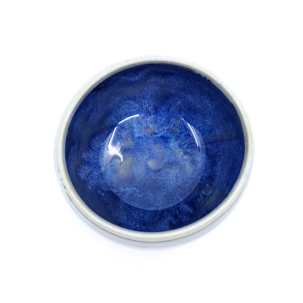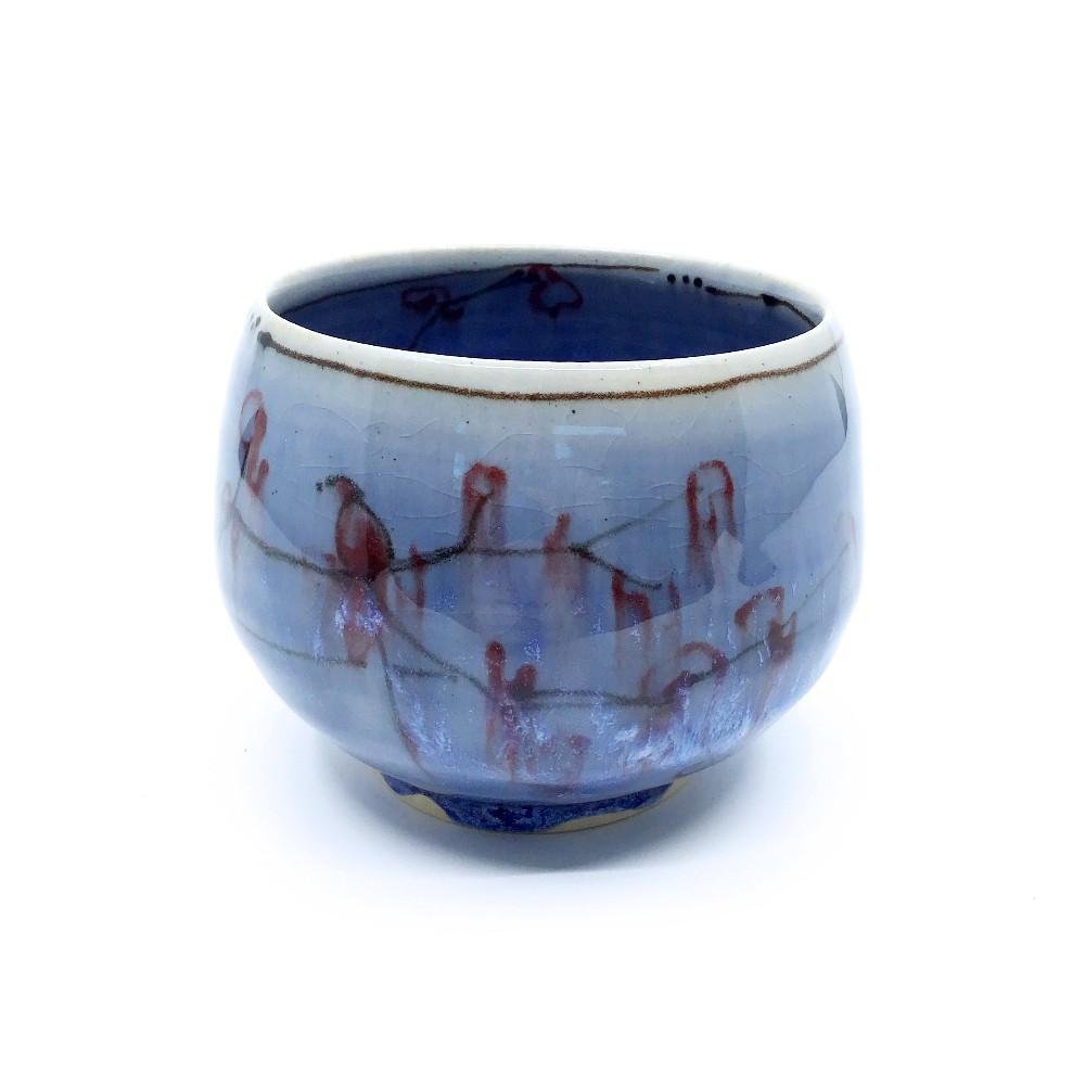 Ceramic yunomi cup in deep blue with hand illustrated elements of cherry blossoms by Natalie Reed. Dishwasher and microwave safe with food safe glaze.
