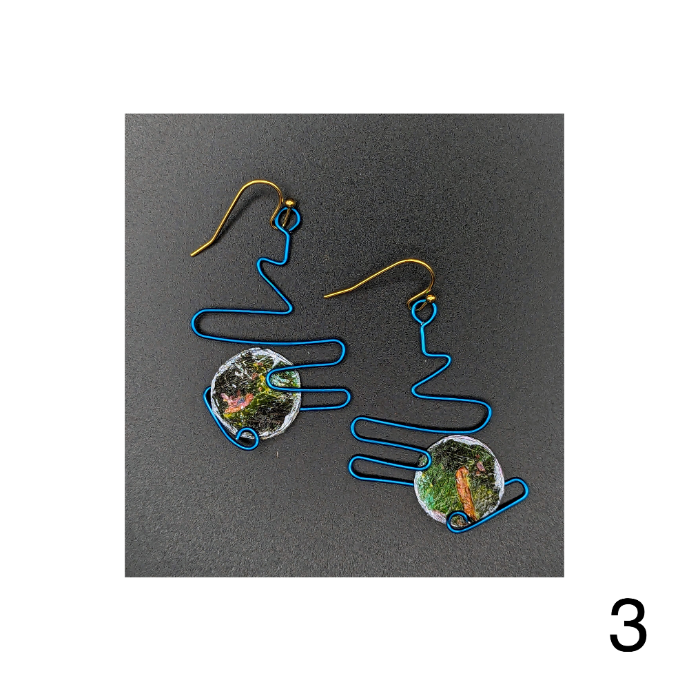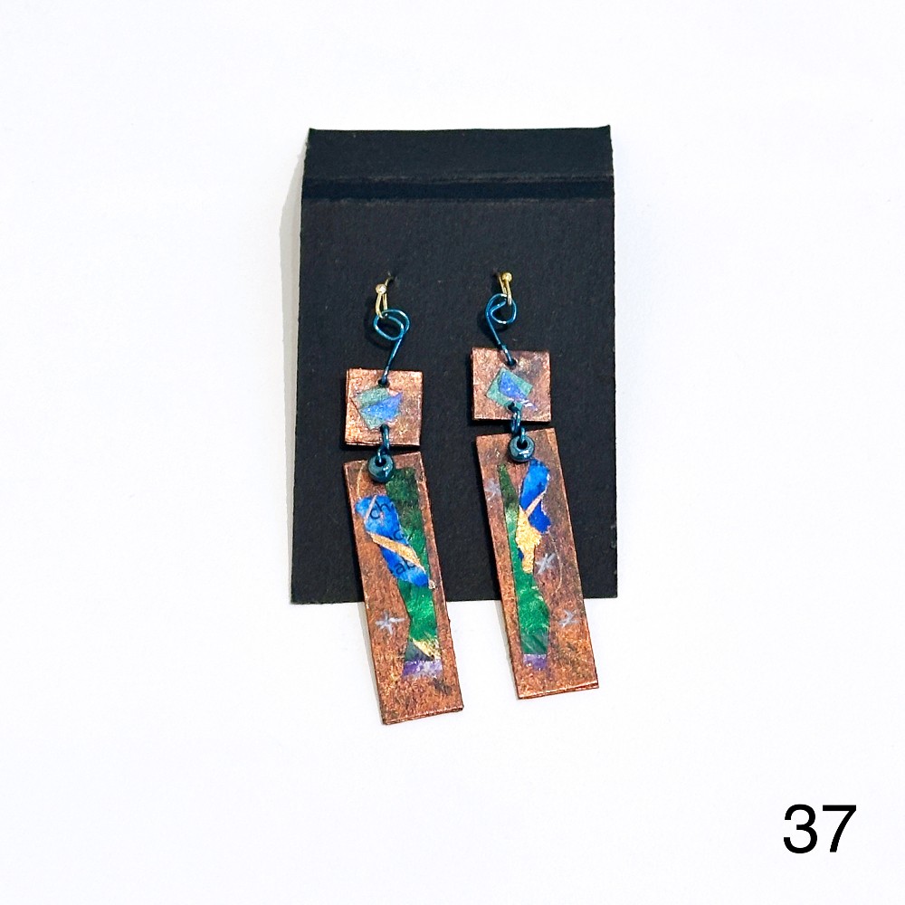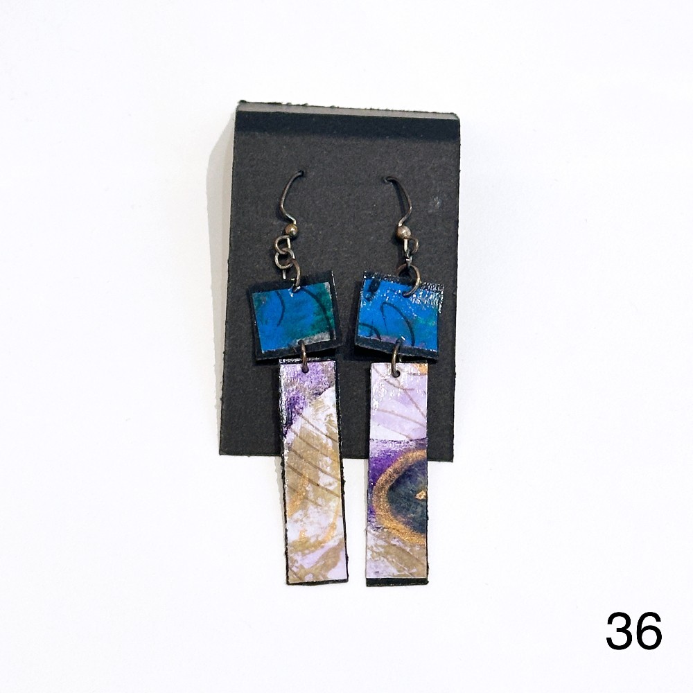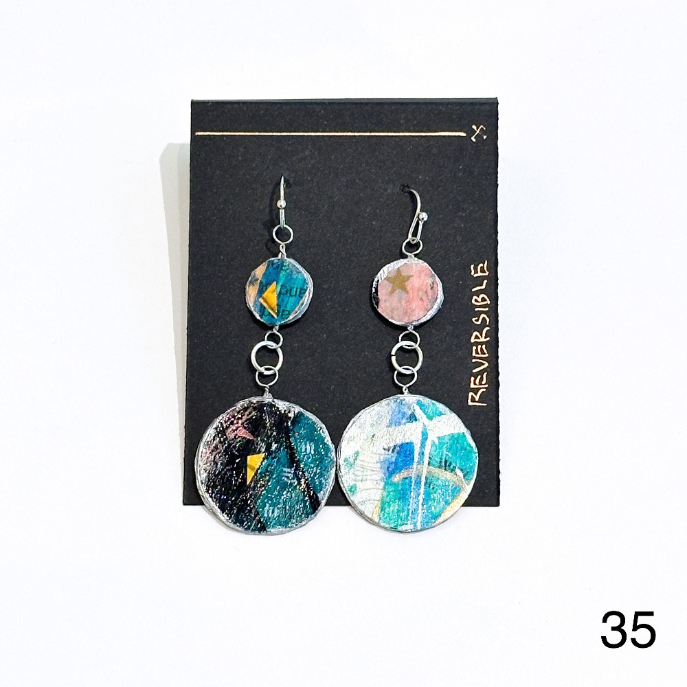 Lightweight paper & wire collage earrings with recycled elements by Bonnie Hossack. All earrings will come with backing.