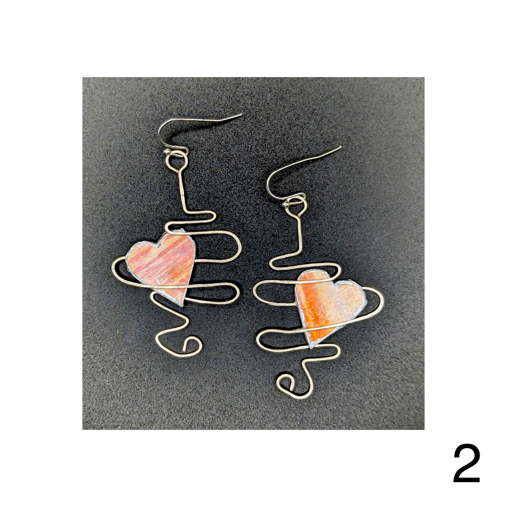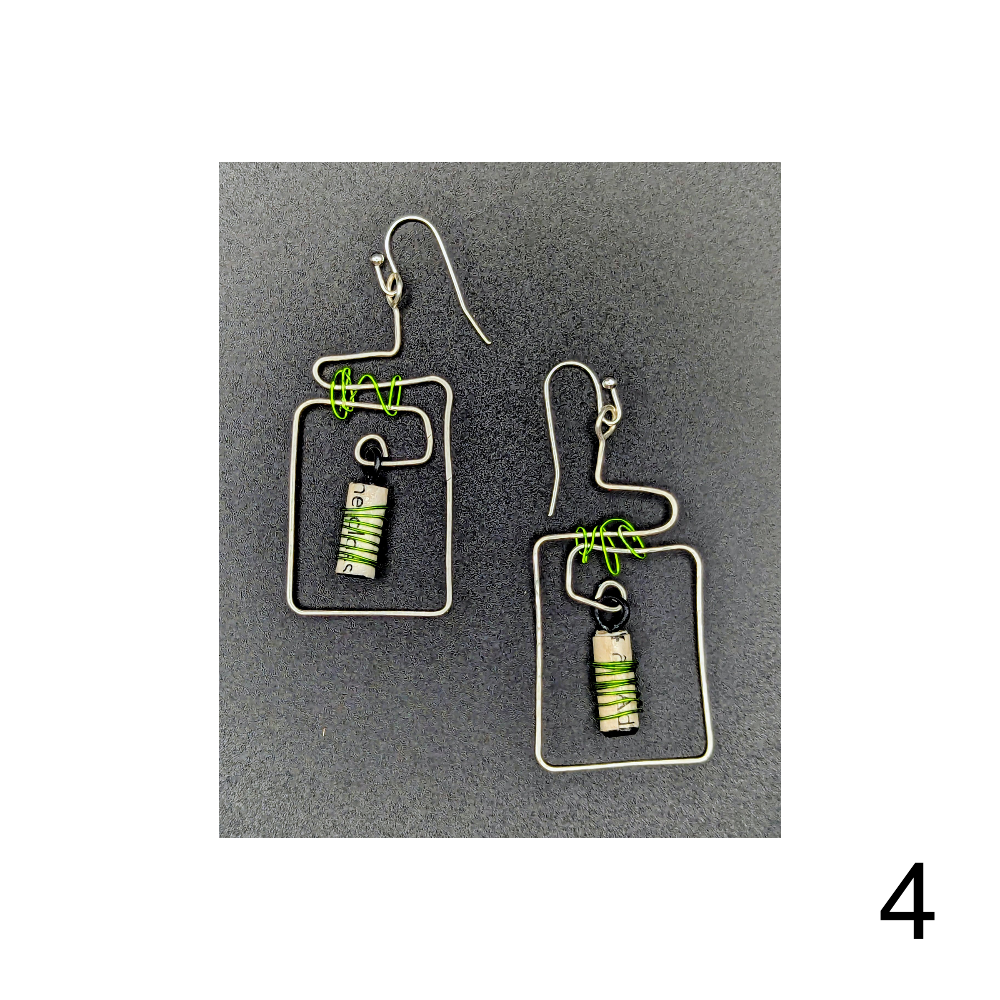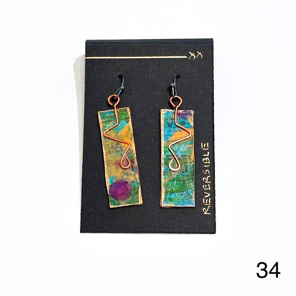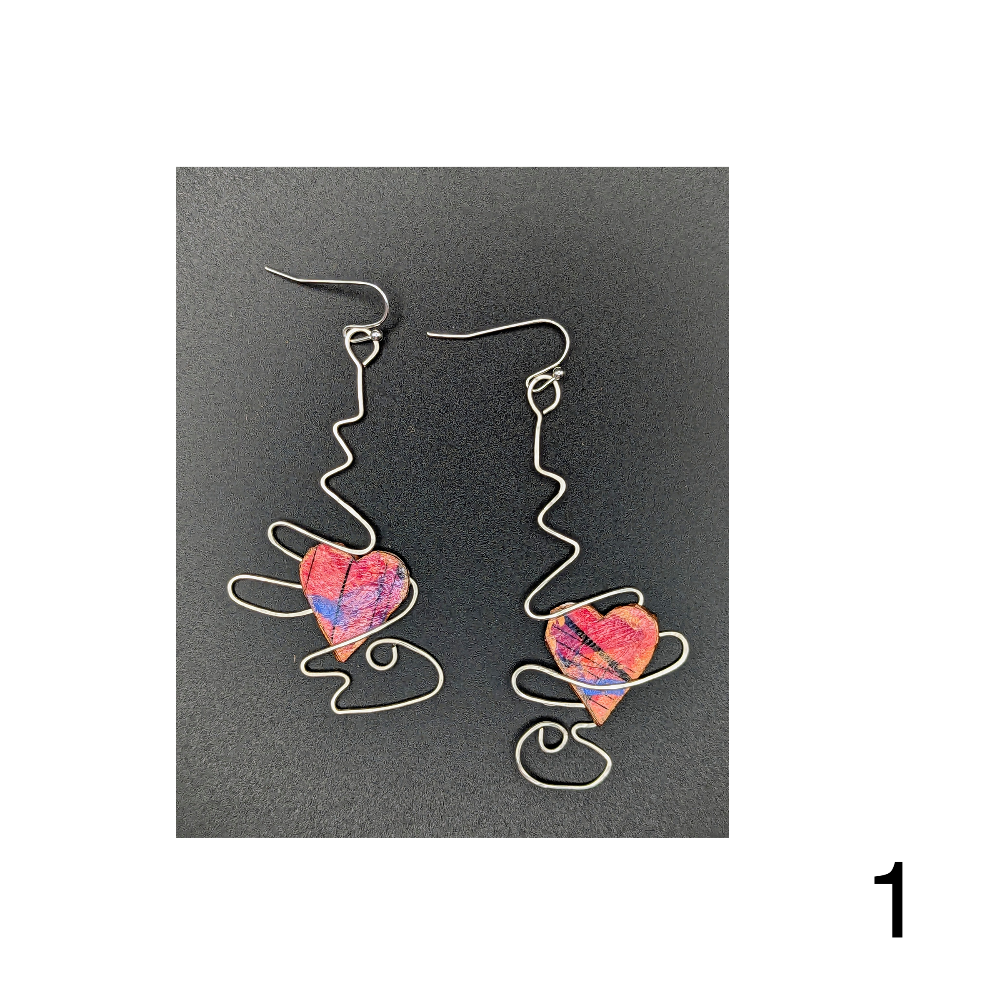 Lightweight paper & wire collage earrings with recycled elements by Bonnie Hossack. All earrings will come with backing.