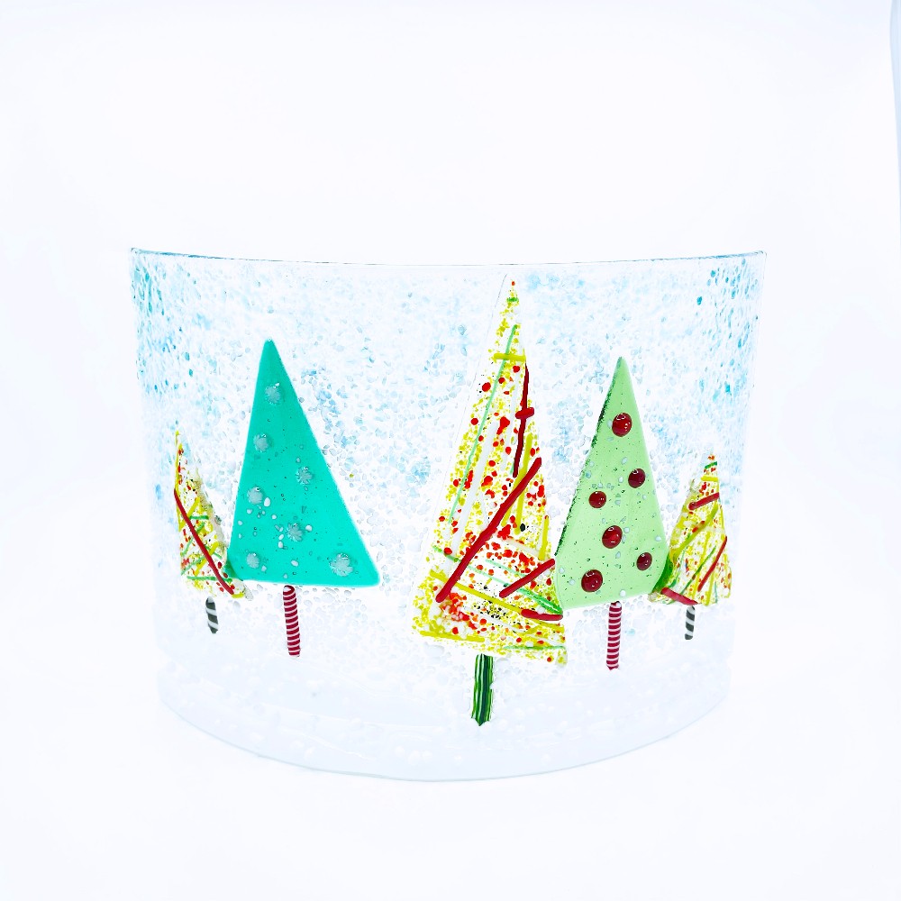 Fused glass curved panel with holiday trees by Valerie NortonCare Instructions: Clean with damp cloth