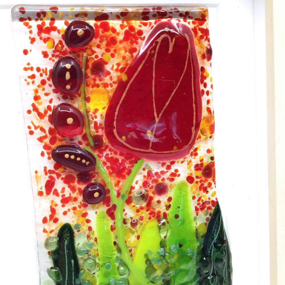 Fused glass with floral scene featuring a red tulip and budding flowers by Valerie Norton