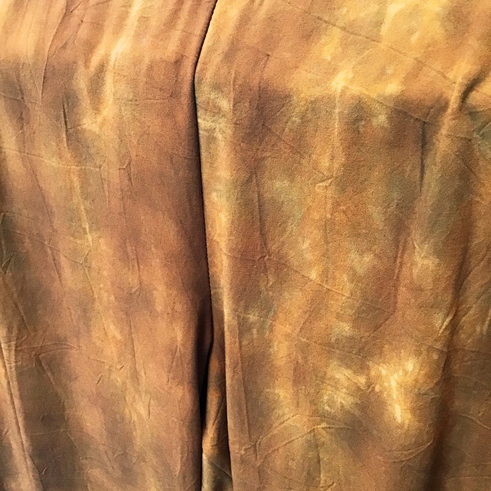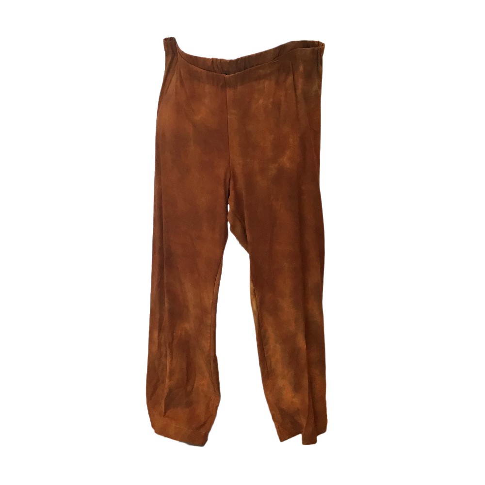 Shibori dyed, bamboo stretch pants in rust tones by Karen Rose. Wash in cold water/delicate setting then tumble dry.