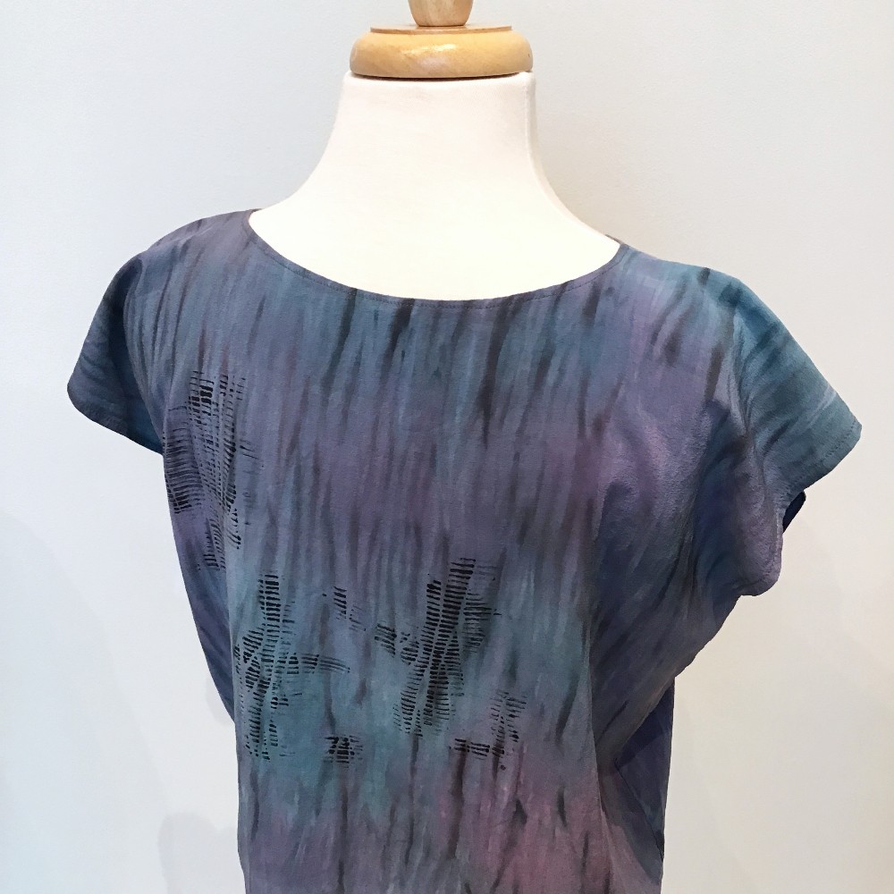 Shibori dyed silk top in cool jewel tones by Karen Rose. Wash in cold water & delicate setting.