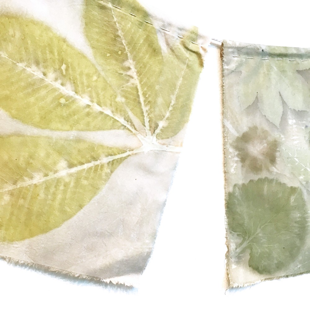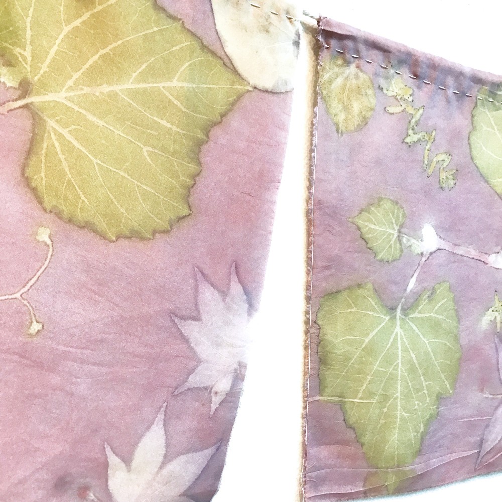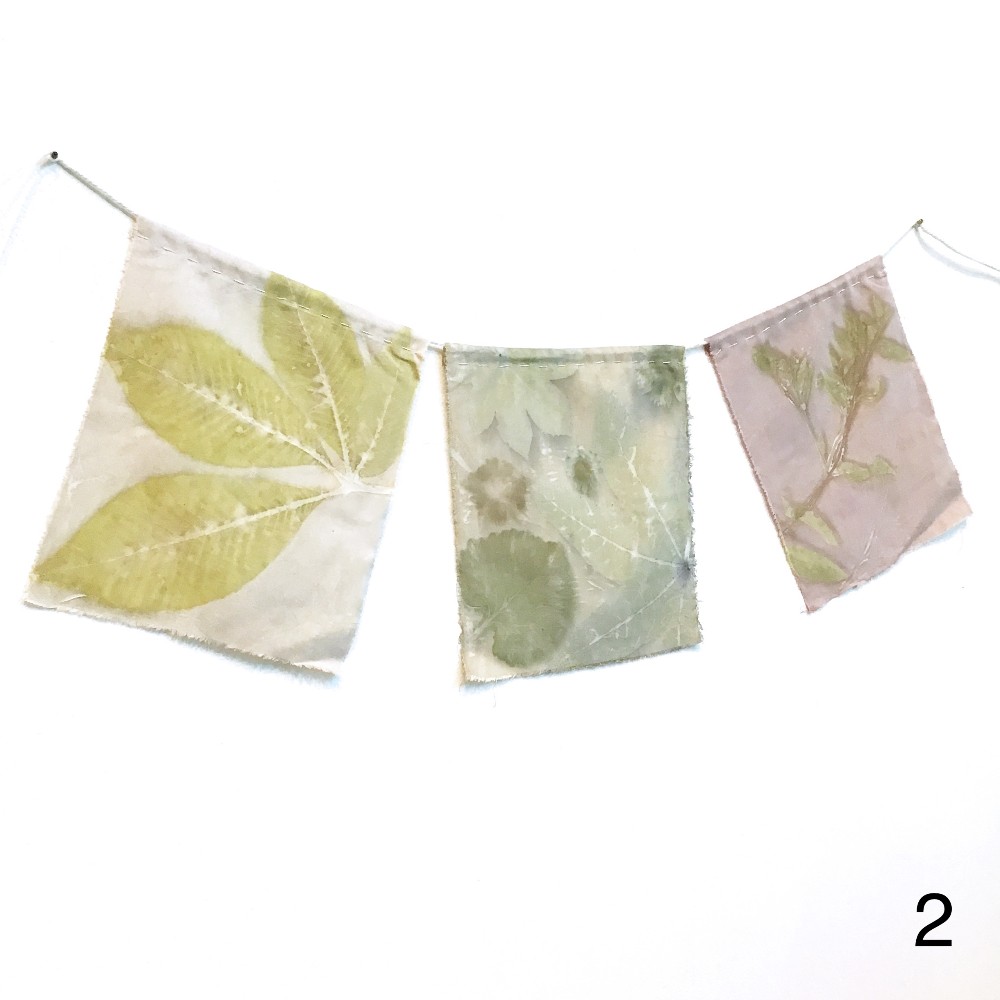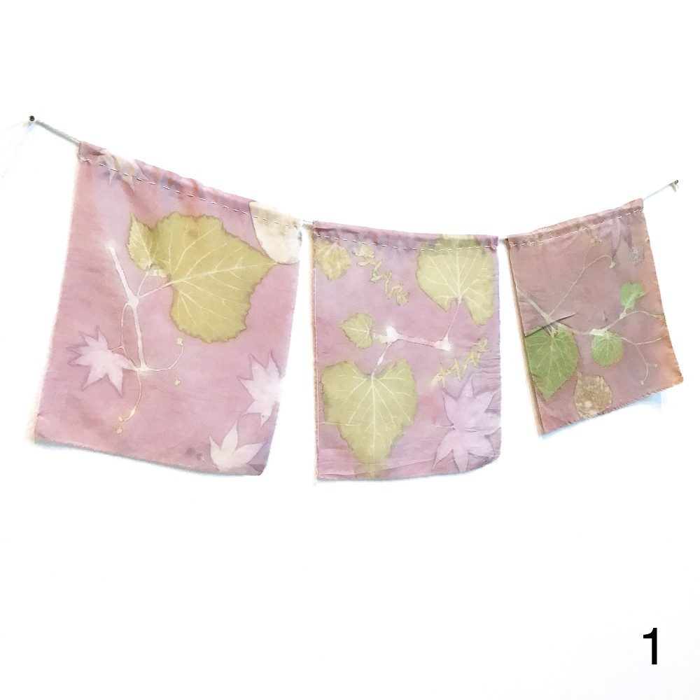 Eco-printed silk prayer flags by Lynda Jacobs. Hang best indoors or under covered patio – out of direct sunlight.