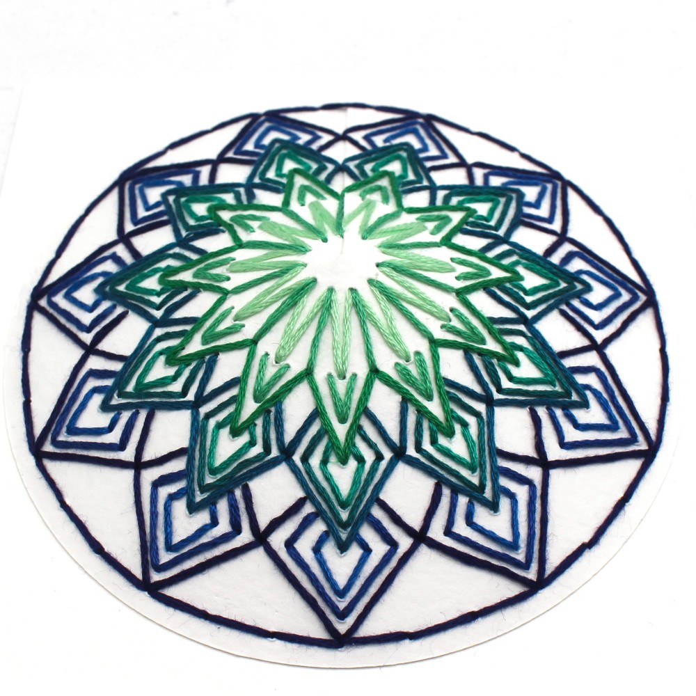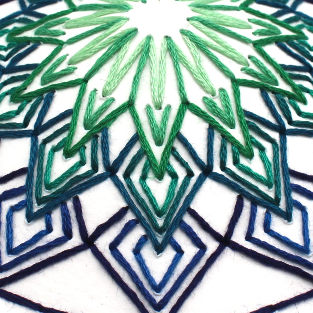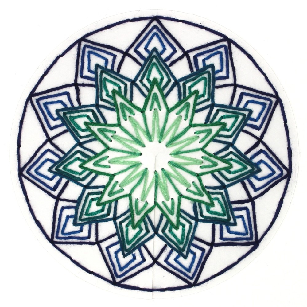 Hand cut and sewn layered paper wall hanging in shades of green and blue by Sarah Robl