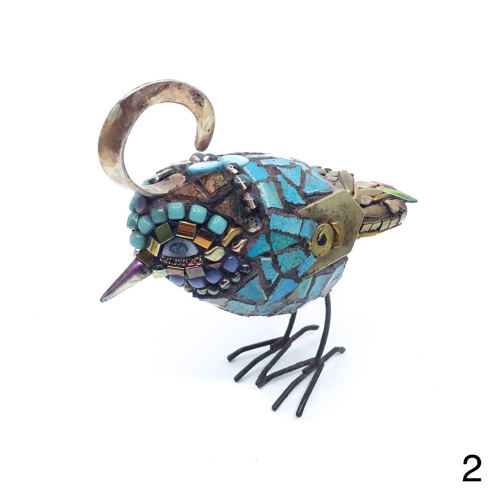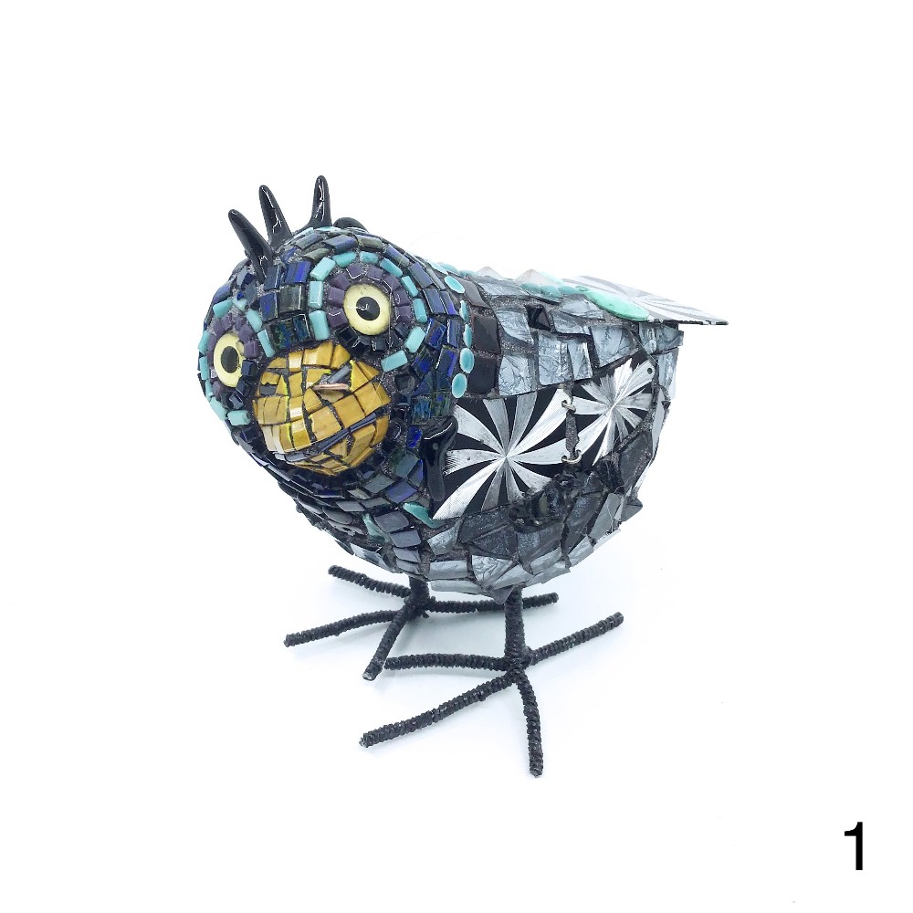 Whimsical mosaic standing bird sculpture by Caryn Brown.