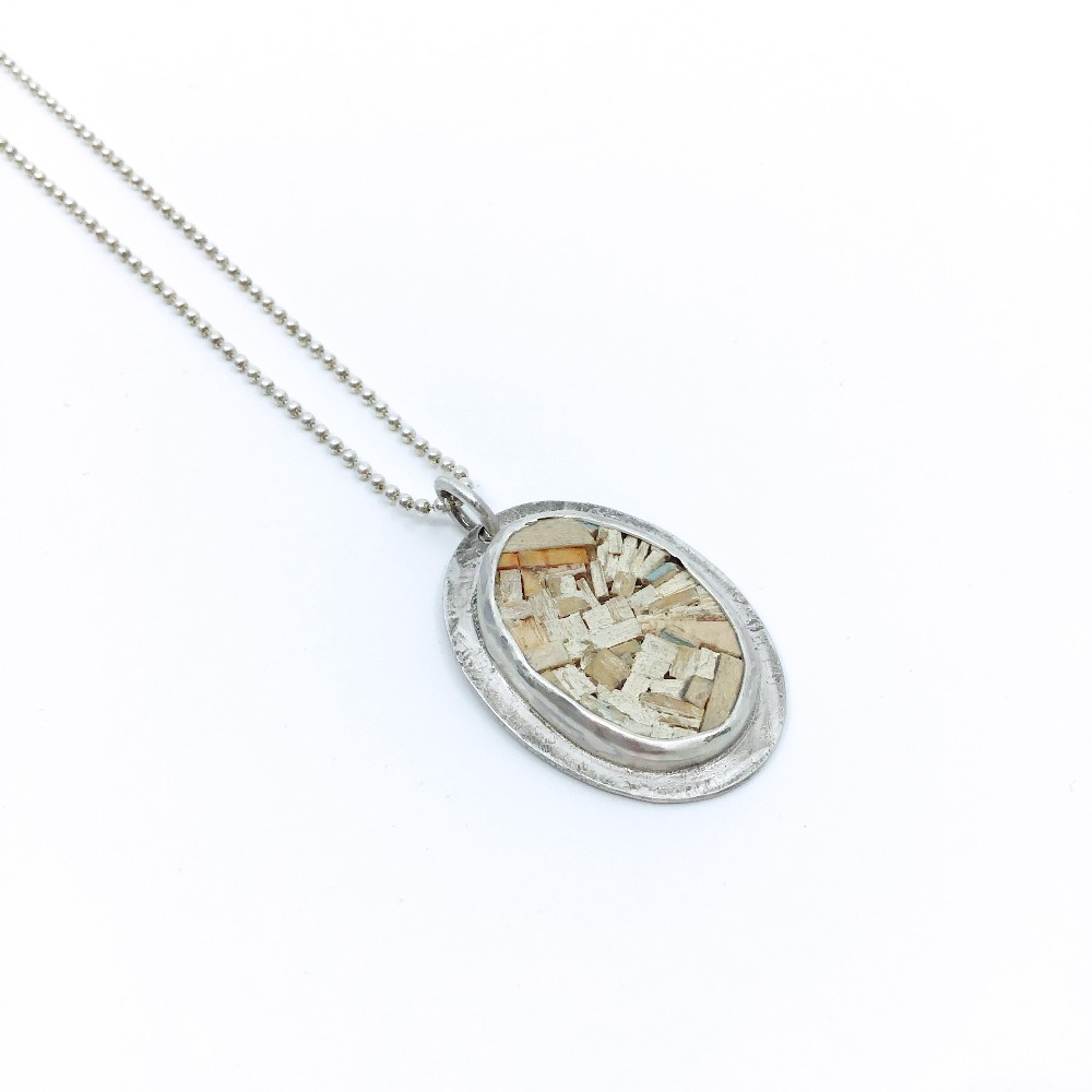 Constructed sterling silver necklace with a wooden pendant by Audrey Peck.