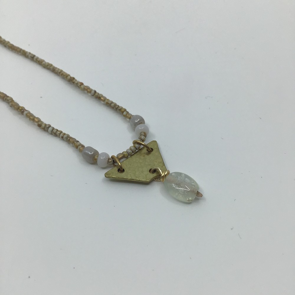 picasso seed bead necklace 20 inches white gold, and cream with quartz and brass accents. 20" chain