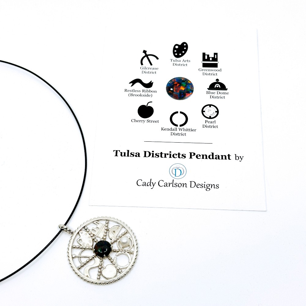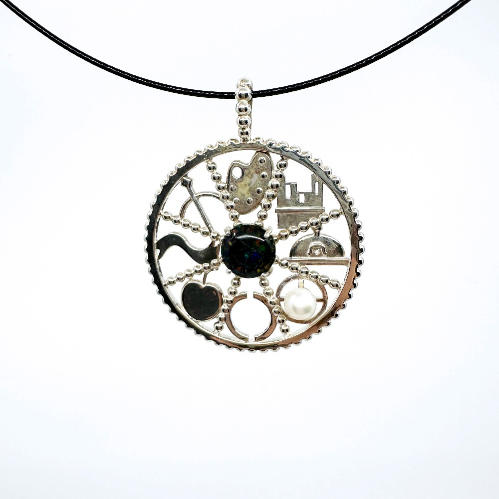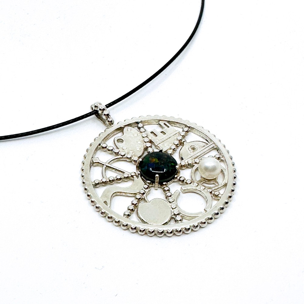 18" coated steel neck wire with pendent made of sterling silver, lab opal, and freshwater pearl