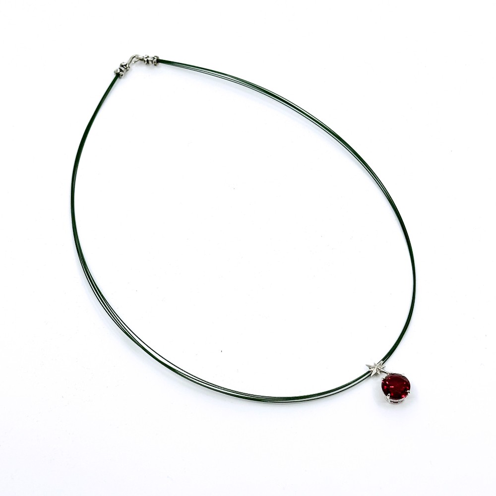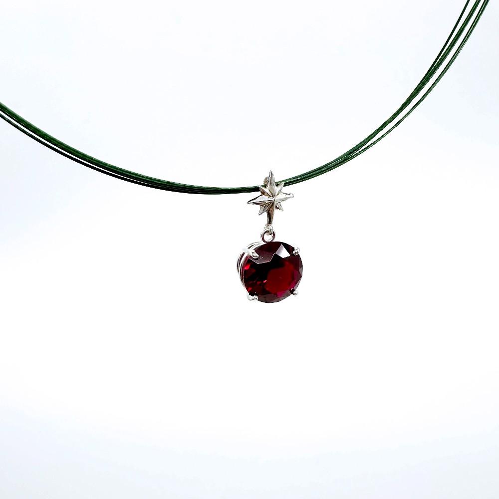 necklace with 18in neck wire and pendent made of Sterling silver, nylon-coated stainless steel, and simulated garnet