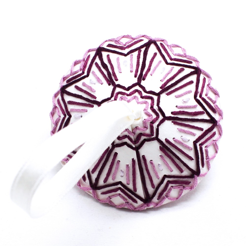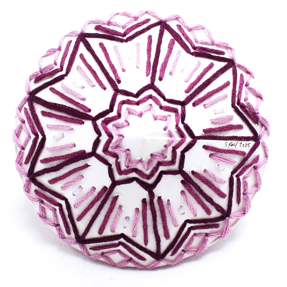 Hand-embroidered ornament with geometric patterning by Sarah Robl
