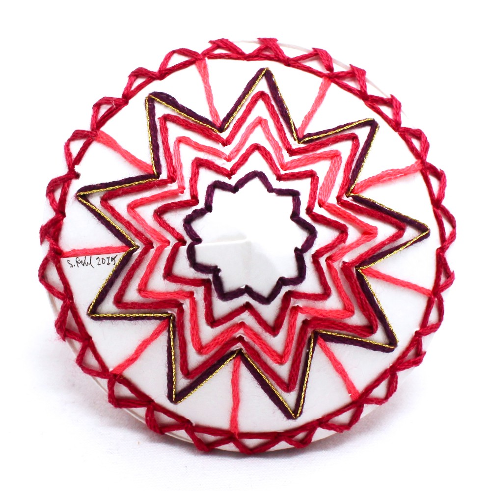 Hand-embroidered ornament with geometric patterning by Sarah Robl
