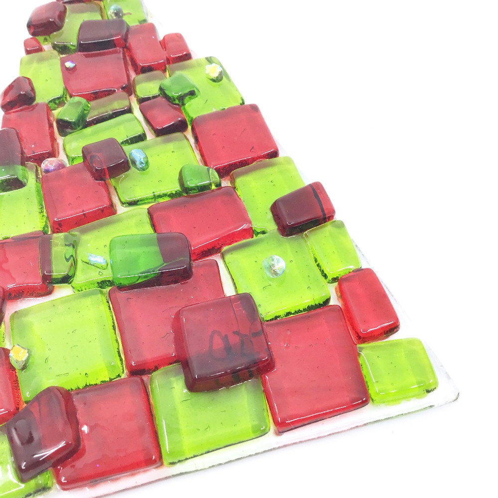 Festive glass tree ornament in shades of green and red by Jenny Dillon