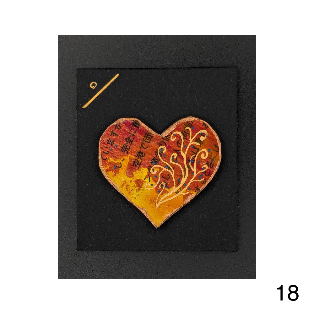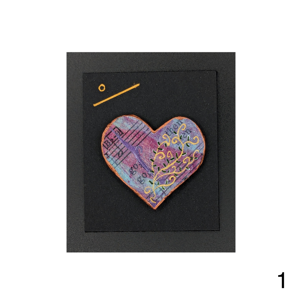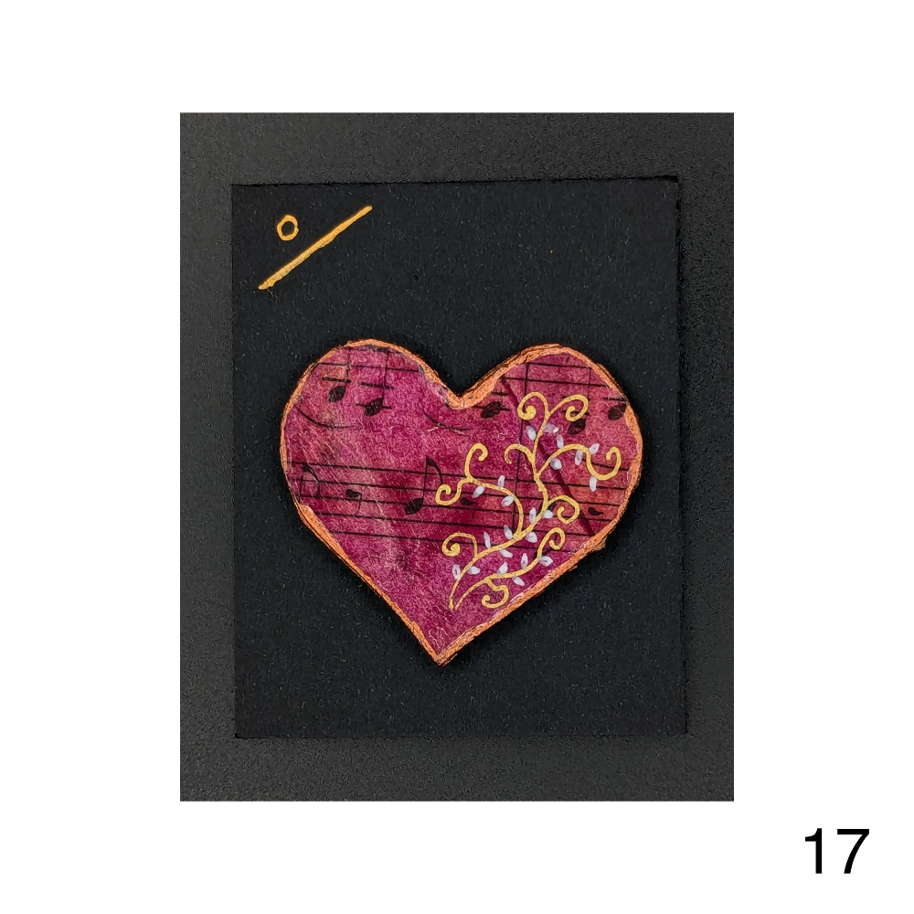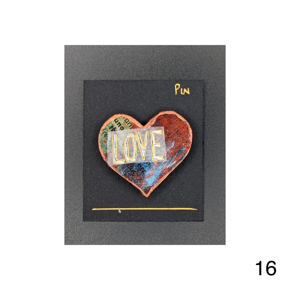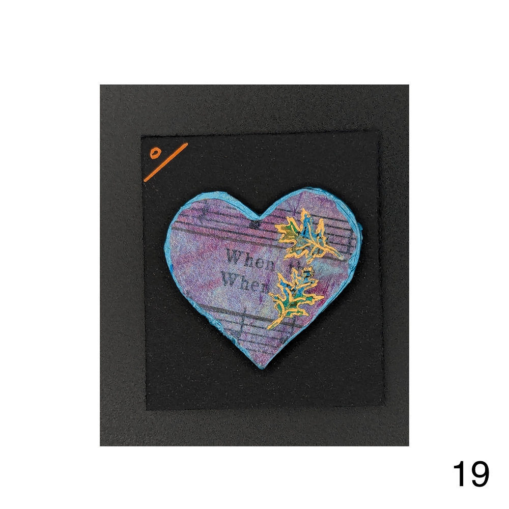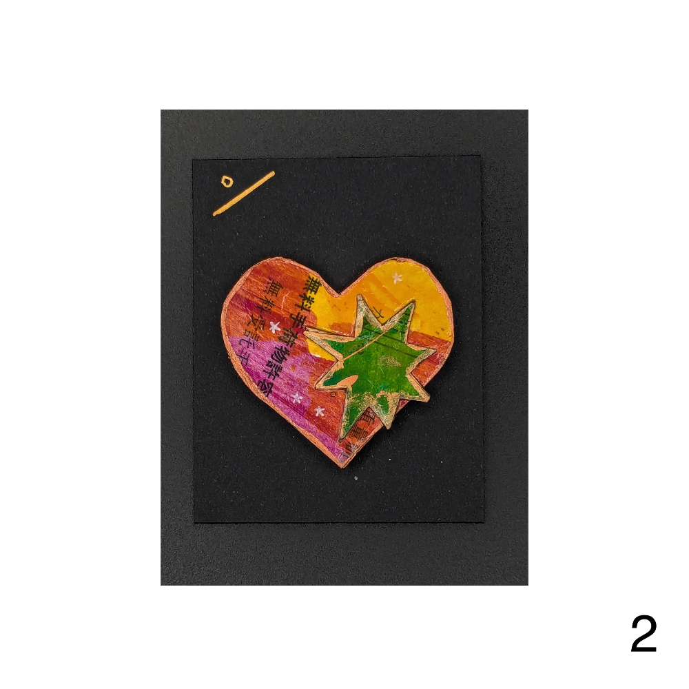 Endearing heart pins made of collage materials (paper, paint) by Bonnie Hossack.