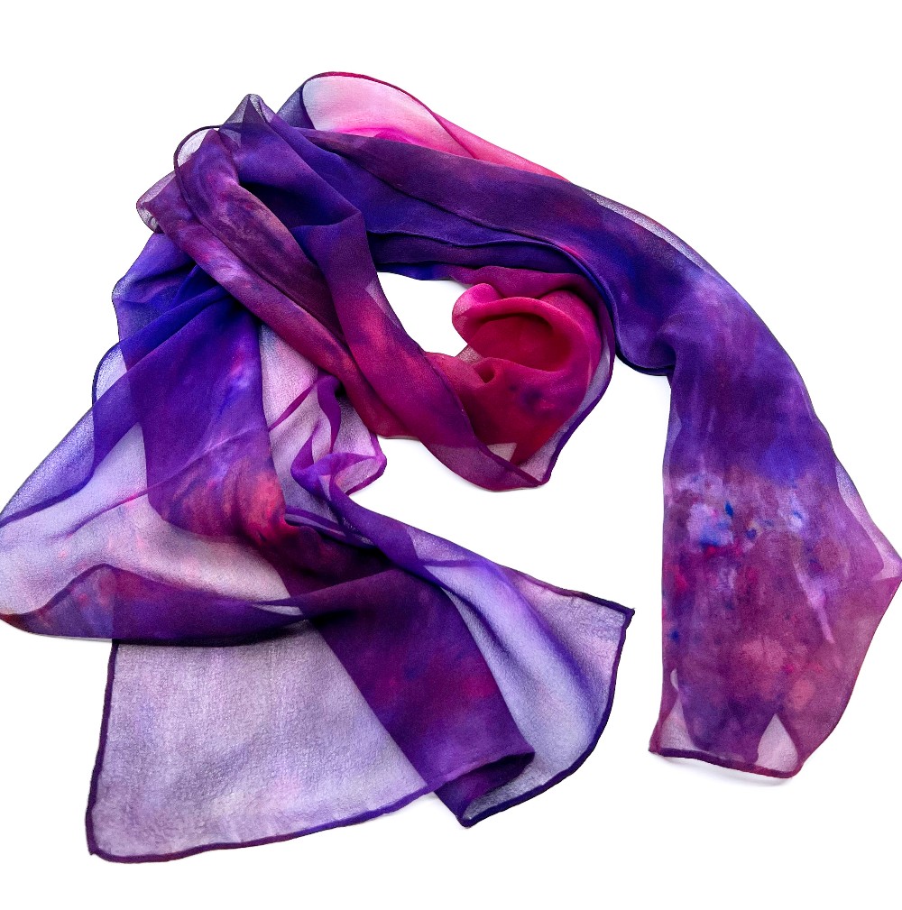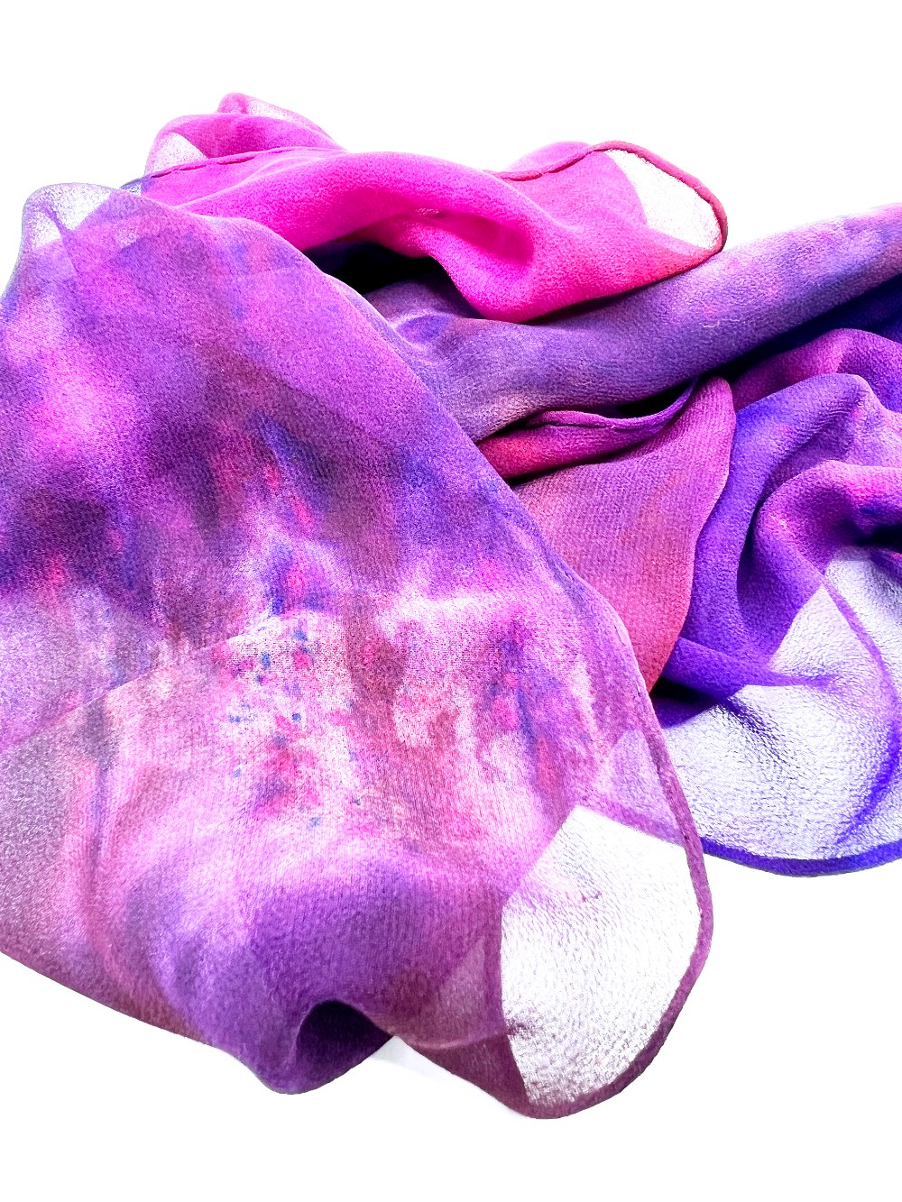 Lightweight silk scarf in pink & purple by Taylor Painter-Wolfe. Hand wash cold & lay flat to dry.
