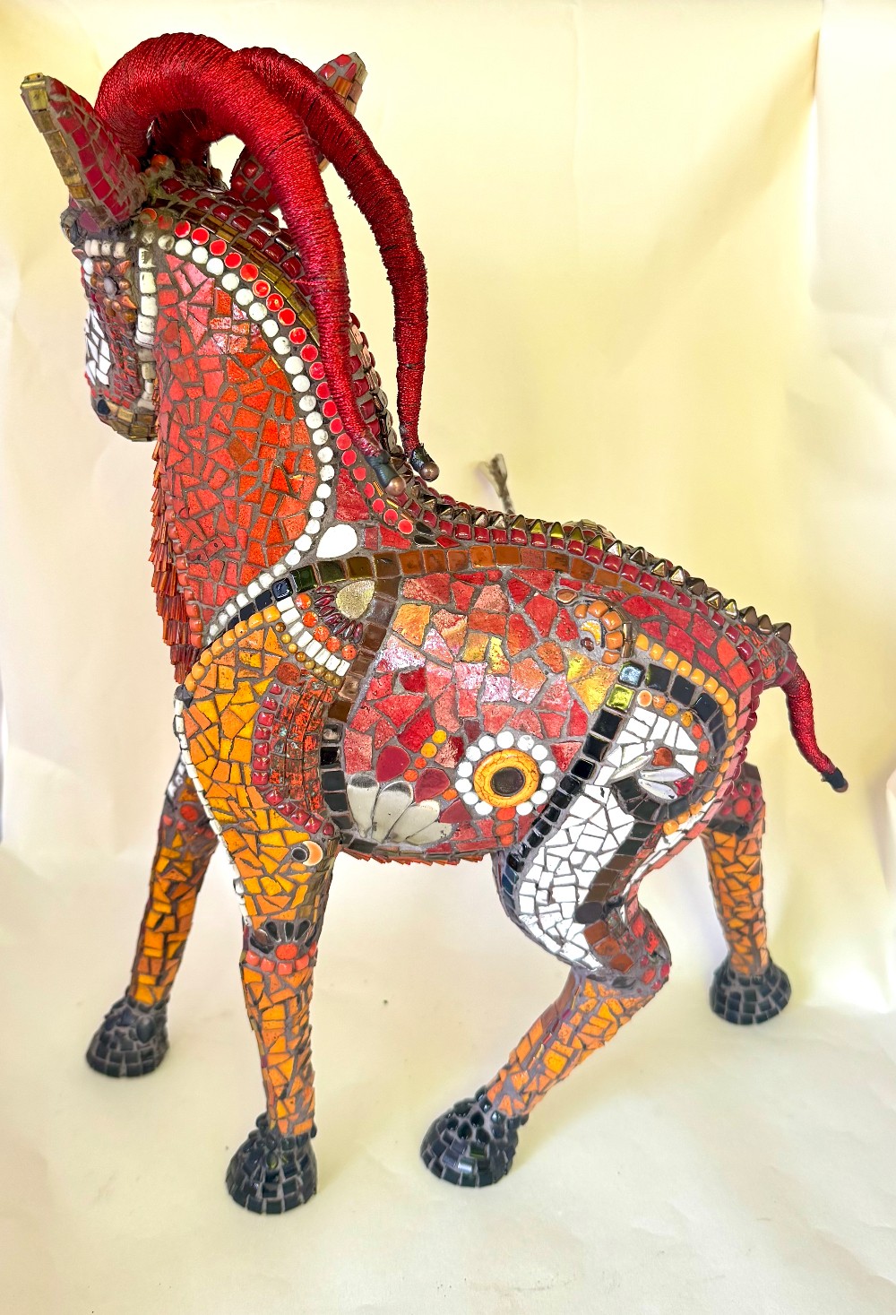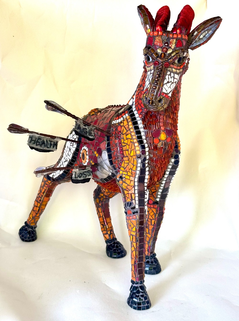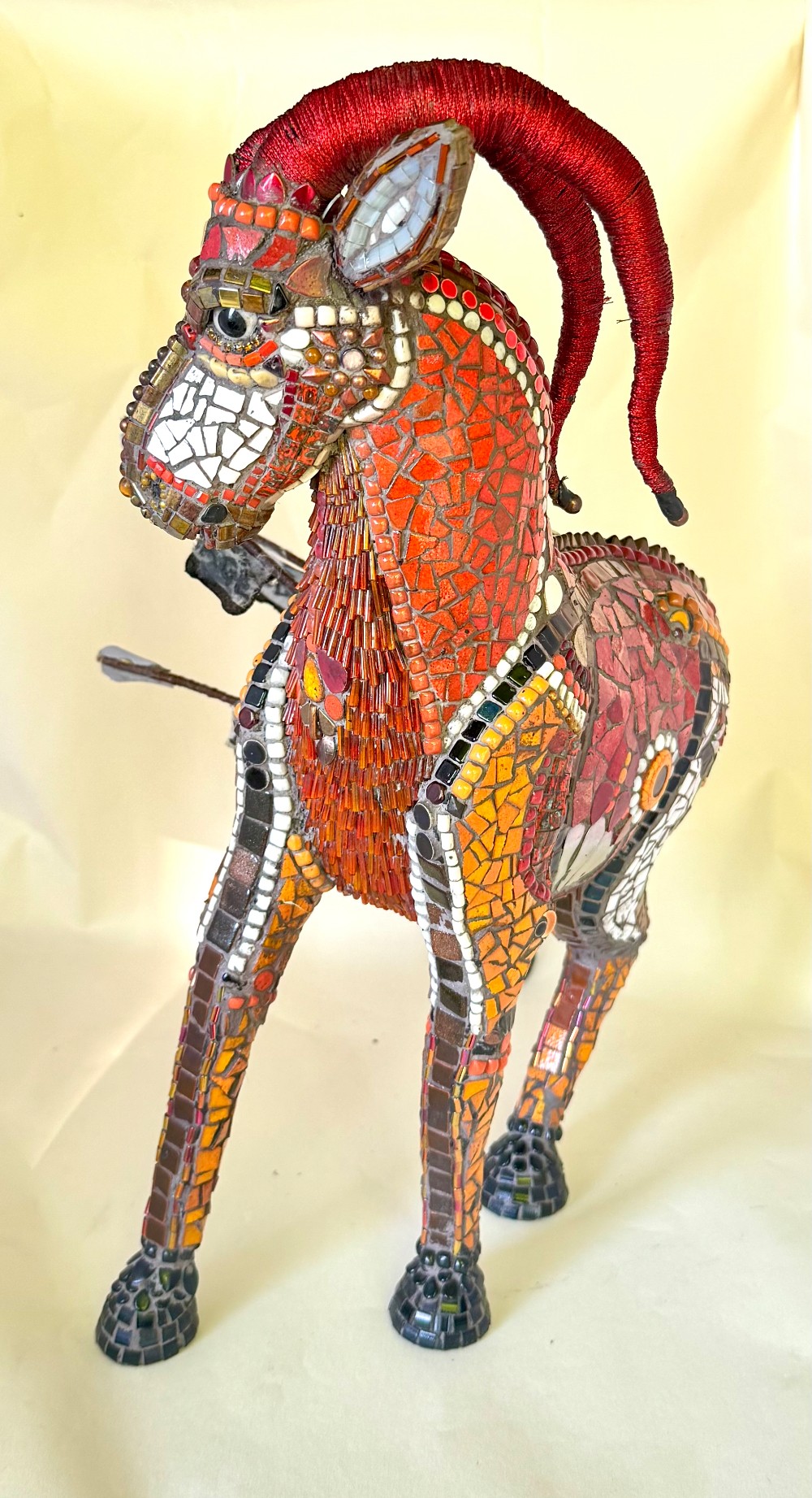 Beads, rake, jewelry findings, embroidery thread, ceramic pieces on a vintage toy animal form; 15" x 12" x 9"