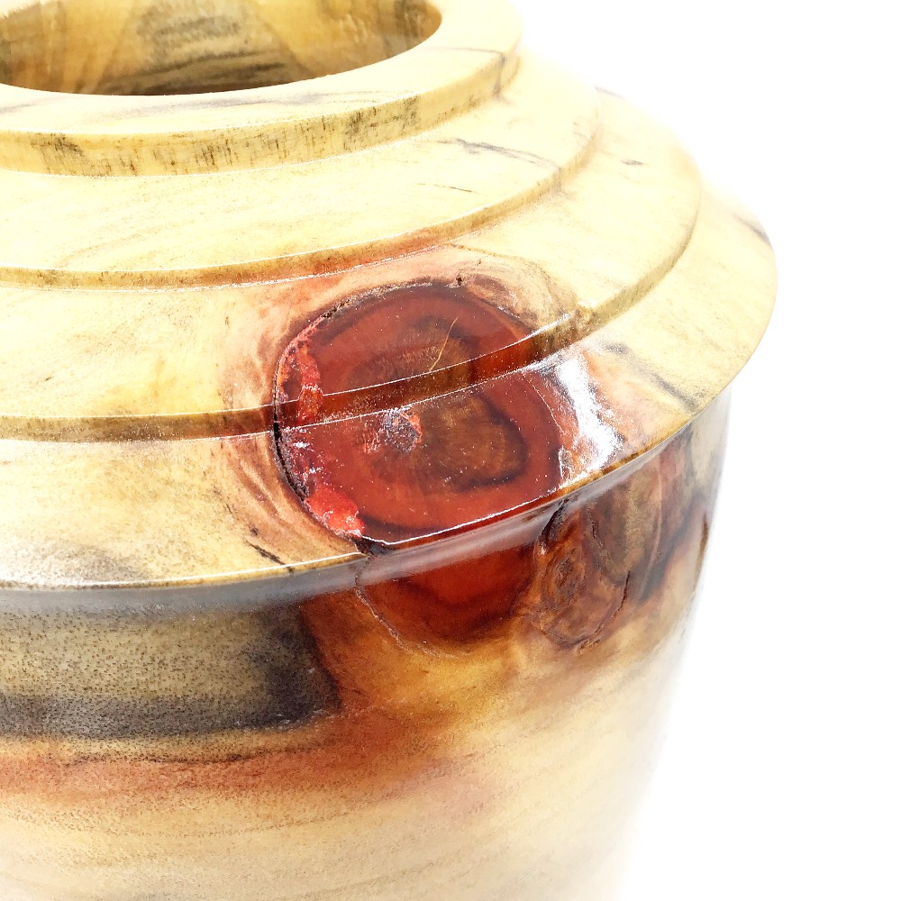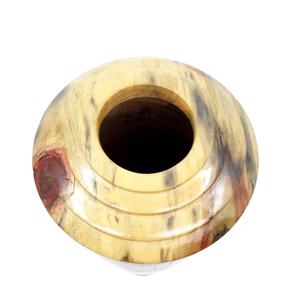 Tall, slender wood vessel made from Norfolk Island Pine that was turned on a bias to highlight the wood's feature by Joe Kissinger